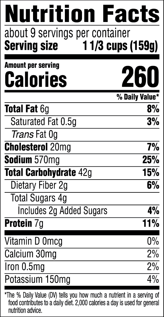Cooked rice (water, rice, sweet cooking rice wine [water, rice, alcohol, salt, enzyme, koji {aspergillus oryzae}]), soy sauce (water, soybeans, wheat, salt), canola oil, oyster flavored sauce (water, sugar, salt, oyster extractives [oyster, water, salt]), oyster extract (water, oyster, salt), sugar, garlic, sesame seed oil, green onions, carrots, peas, corn, salt, xanthan gum, caramel color, ginger, onion, yeast extract.